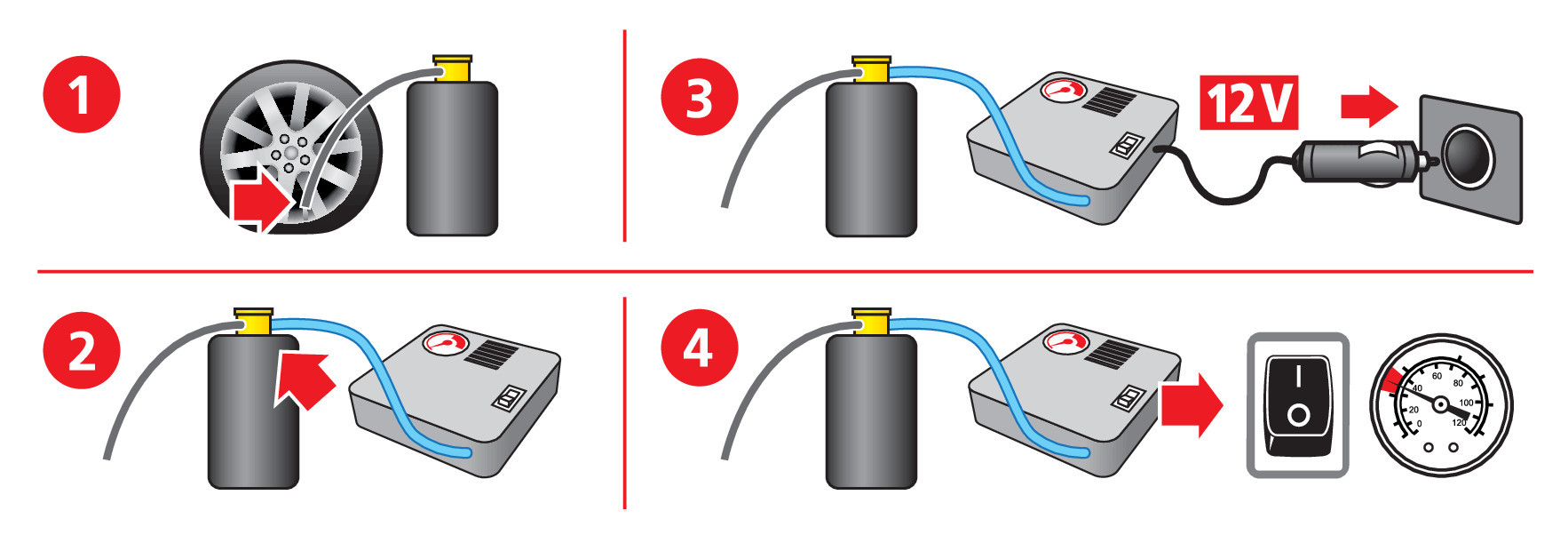 • È sufficiente utilizzare un buon compressore 12V per iniettare il sigillante, riparare la foratura e gonfiare lo pneumatico in una unica operazione.