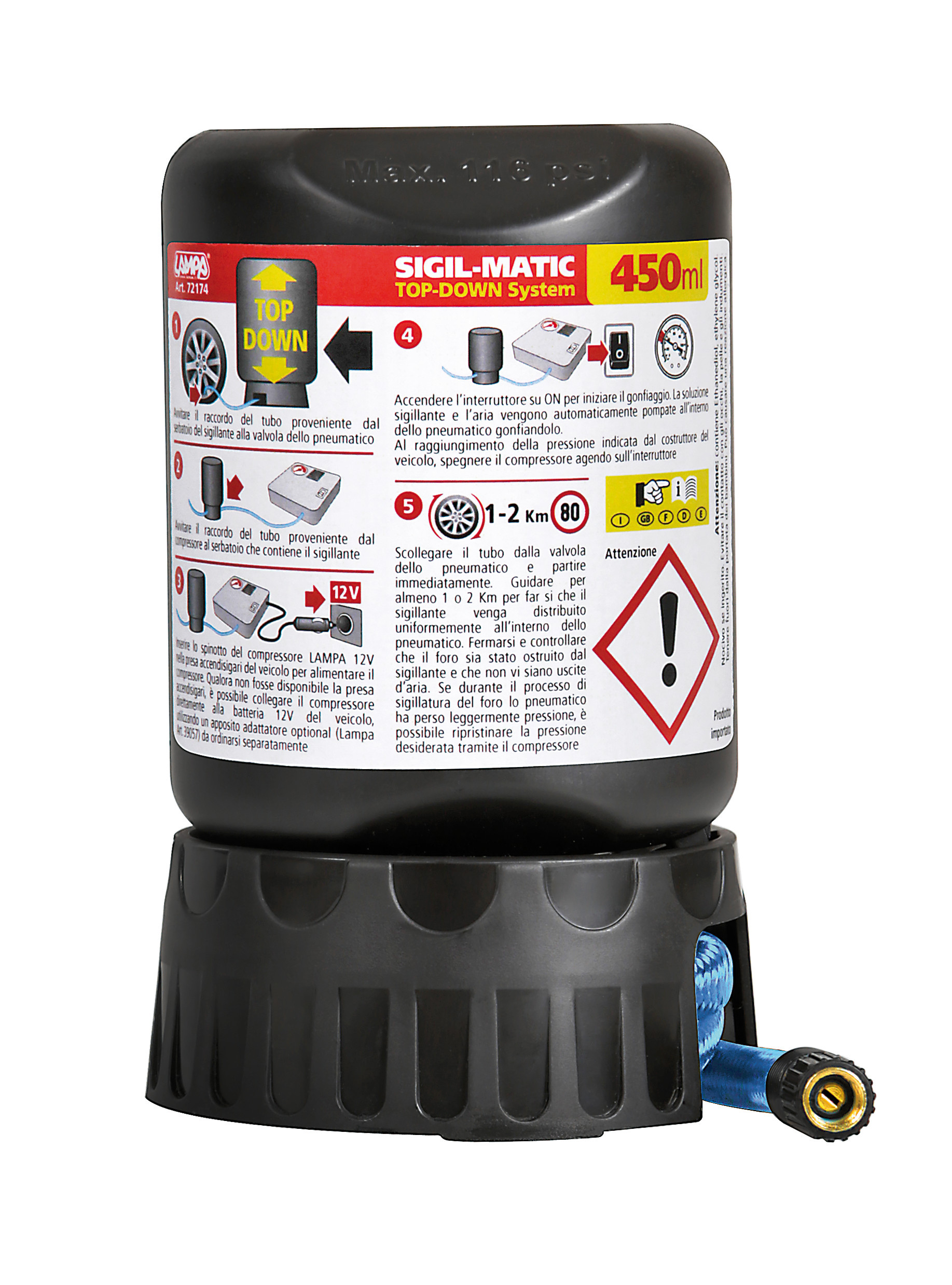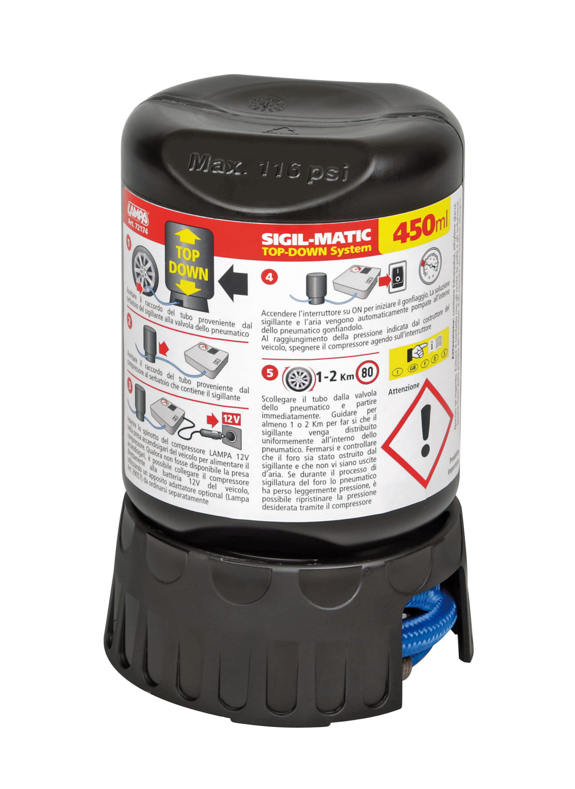 • È sufficiente utilizzare un buon compressore 12V per iniettare il sigillante, riparare la foratura e gonfiare lo pneumatico in una unica operazione.