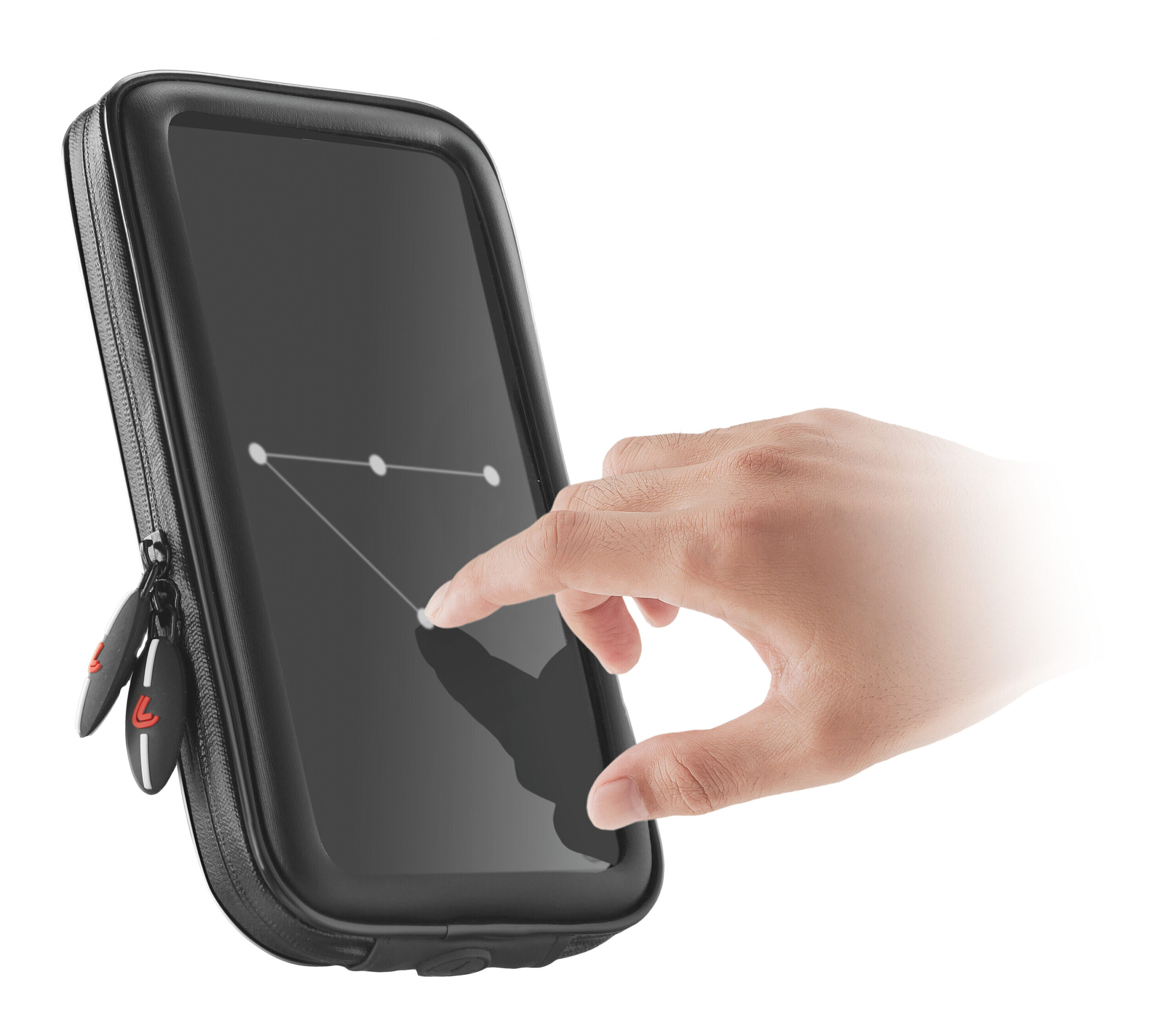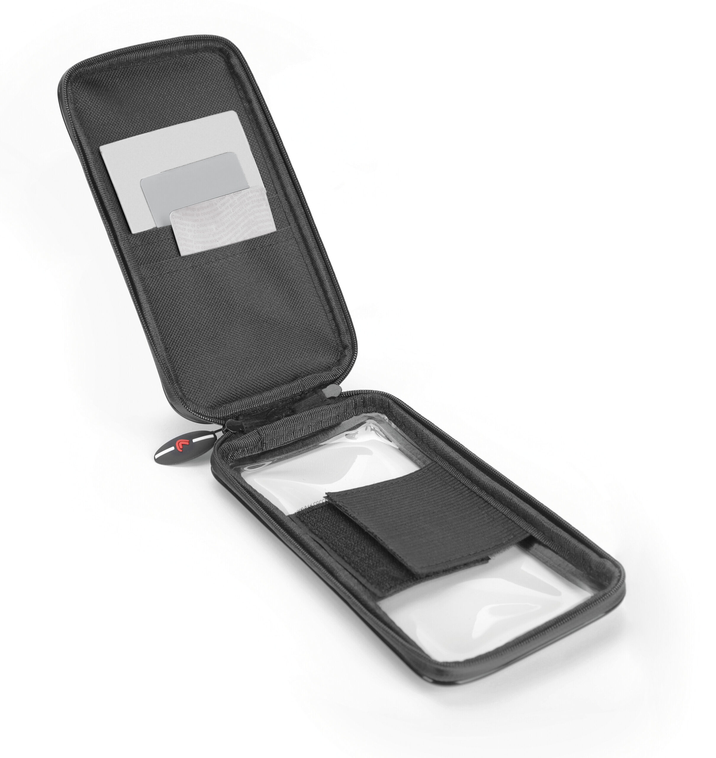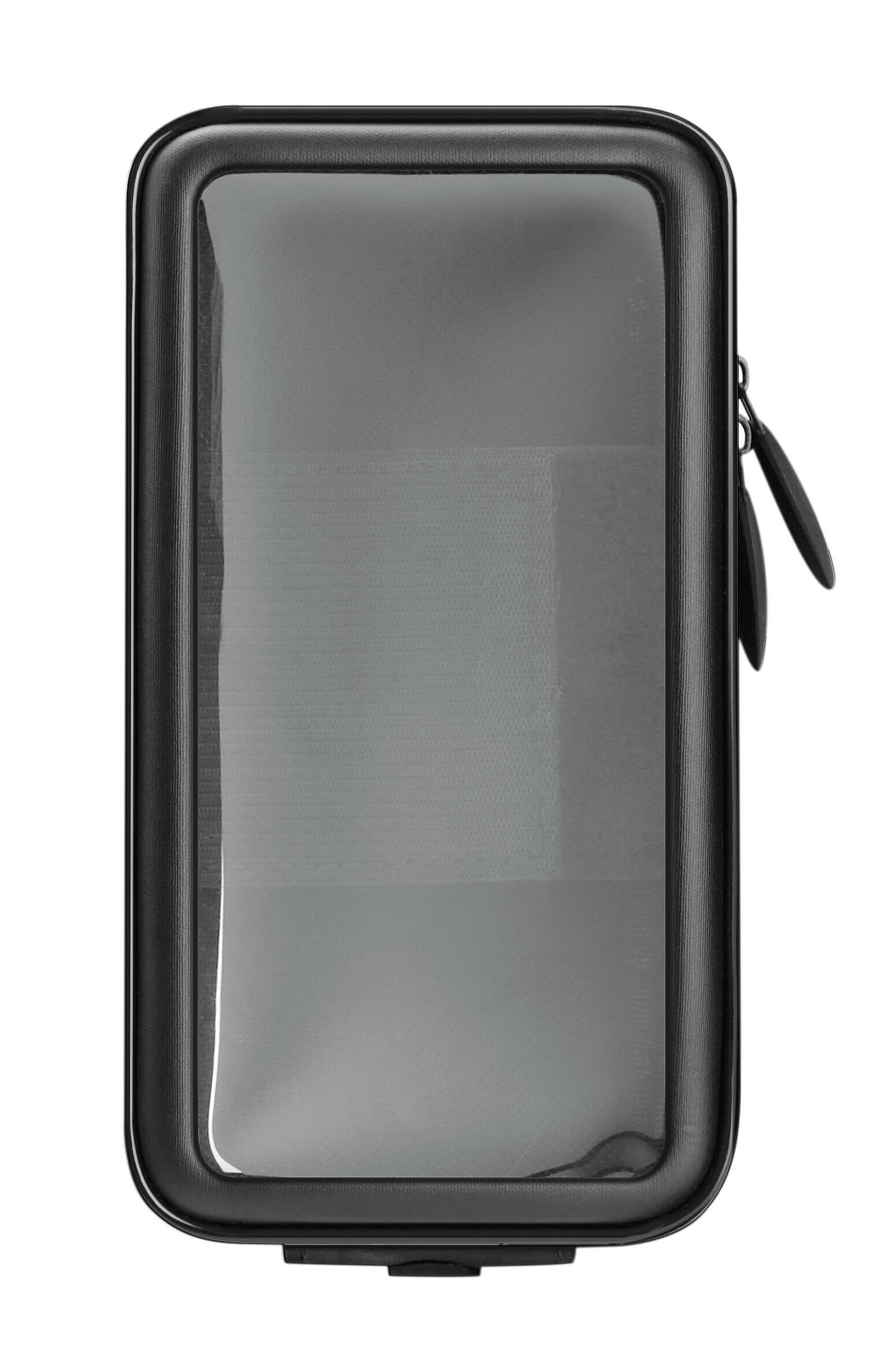• Pellicola frontale trasparente per consentire l’utilizzo del touch screen, fissata tramite termosaldatura per aumentare la resistenza alla pioggia. Zip laterali impermeabili.