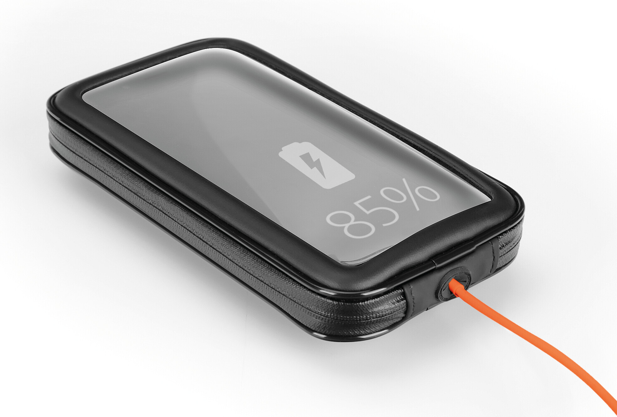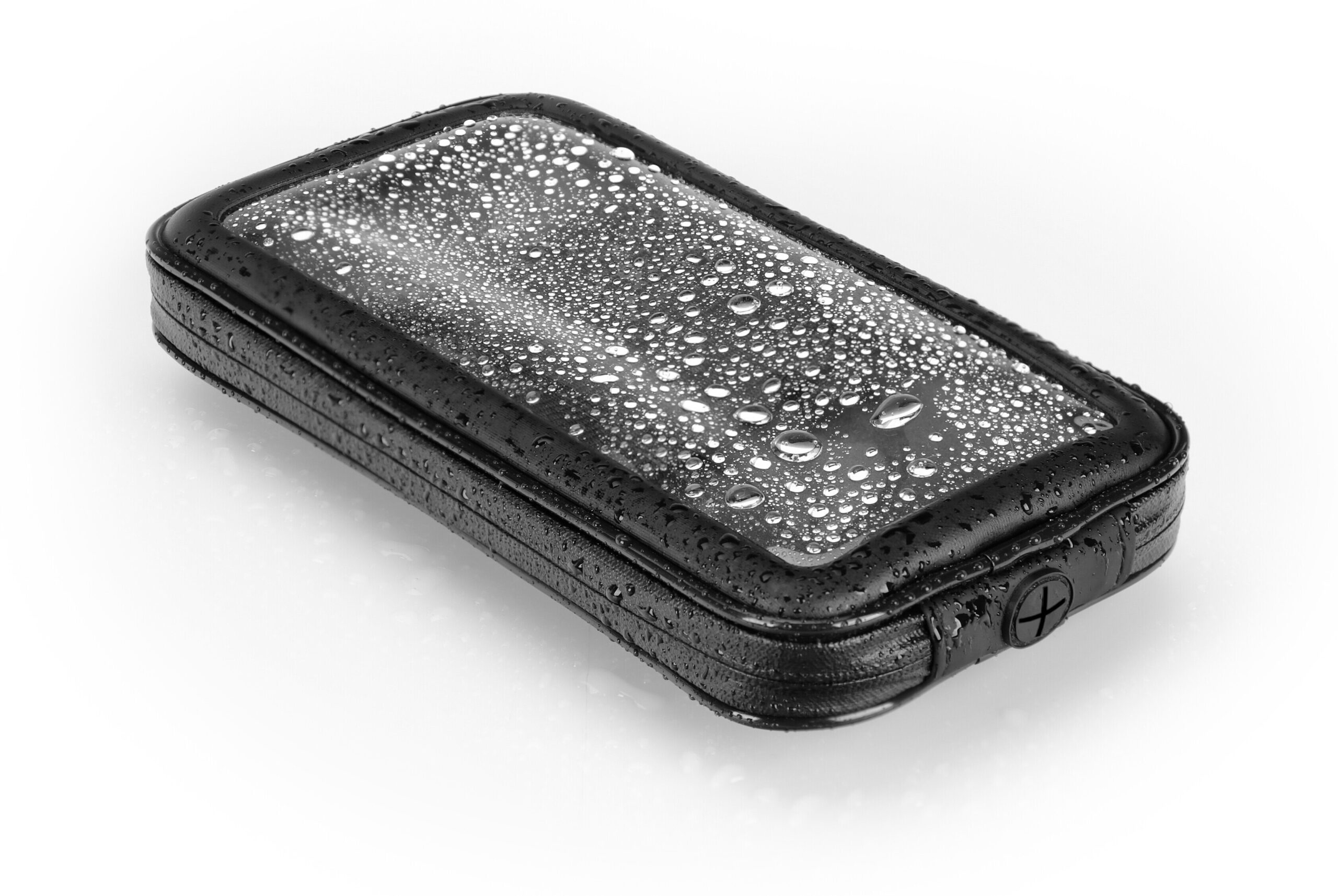 • Pellicola frontale trasparente per consentire l’utilizzo del touch screen, fissata tramite termosaldatura per aumentare la resistenza alla pioggia. Zip laterali impermeabili.