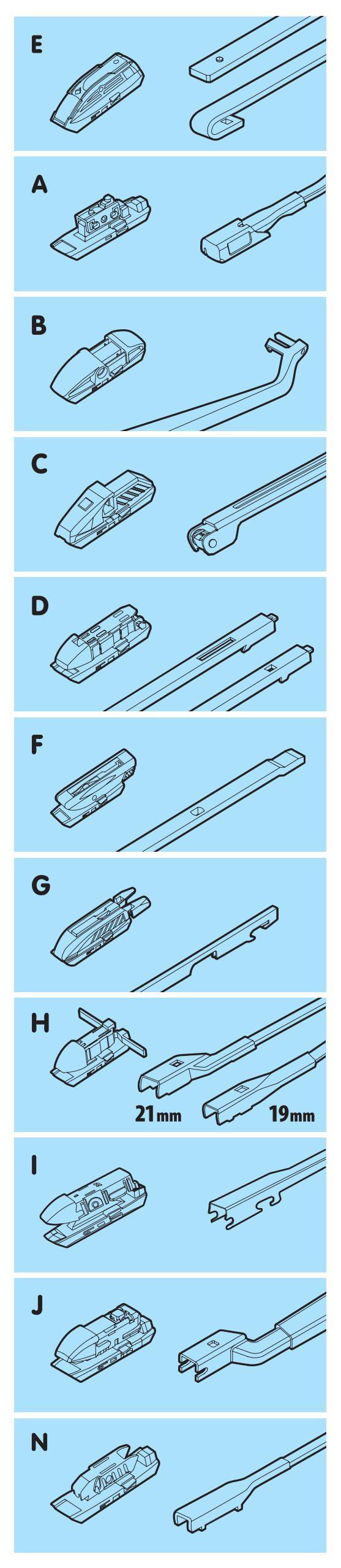 • 1 raccordo per il montaggio su tutte le vetture equipaggiate con tergicristalli tradizionali.
