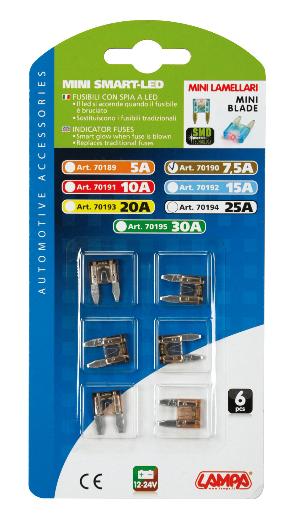 Smart Led, set 6 micro-fusibili lamellari con spia a led, 12/32V – 7,5A