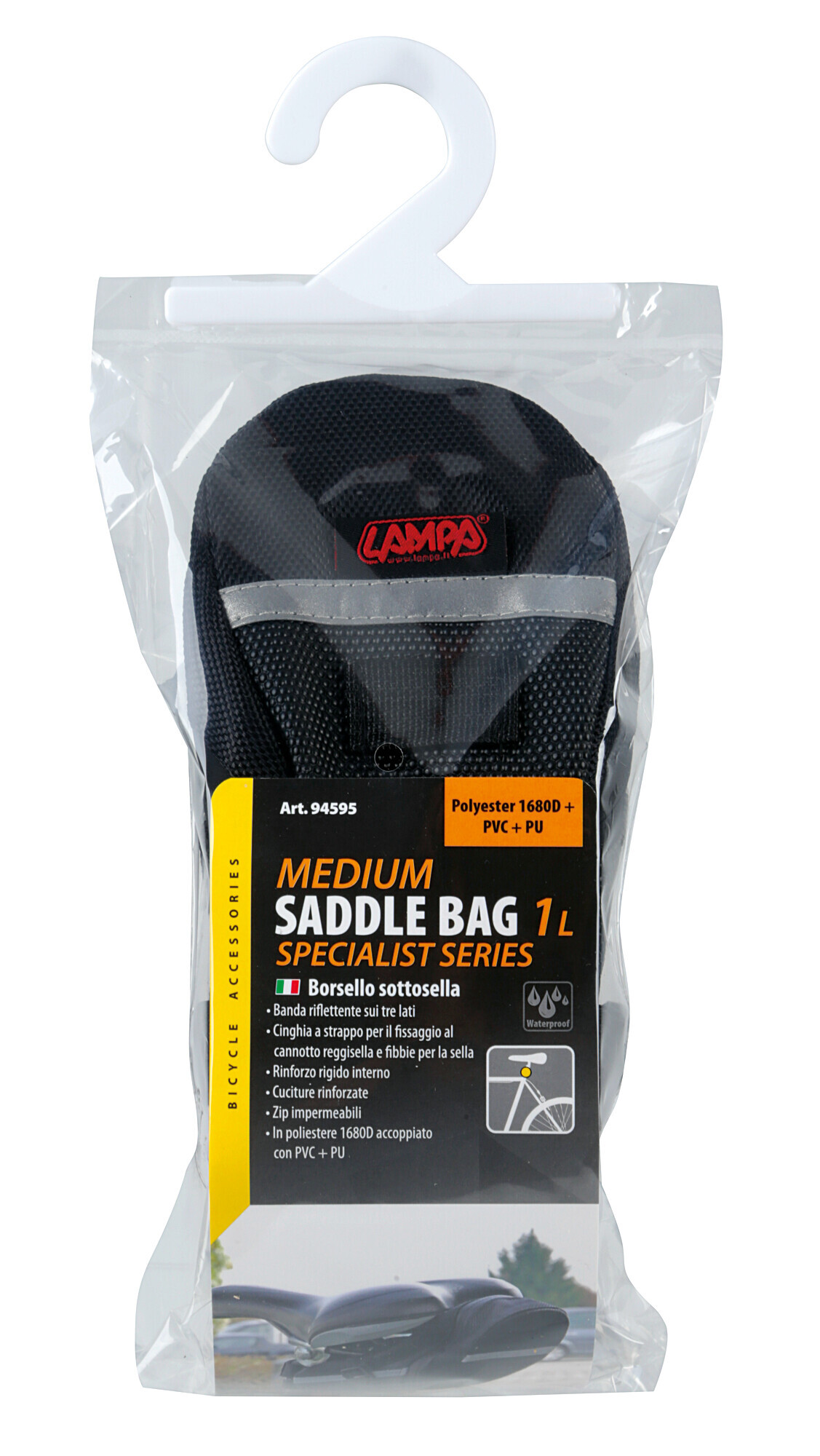 Impermeabile. Banda riflettente sui tre lati. Cinghia a strappo per il fissaggio al cannotto reggisella e fibbie per la sella. Rinforzo rigido interno. Cuciture rinforzate. Zip impermeabili. In poliestere 1680D accoppiato con PVC + Skeentex