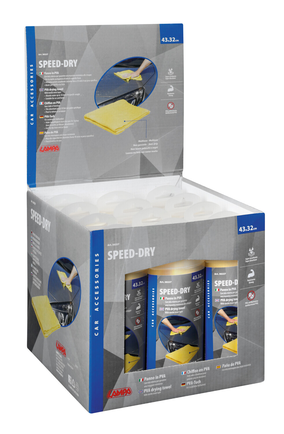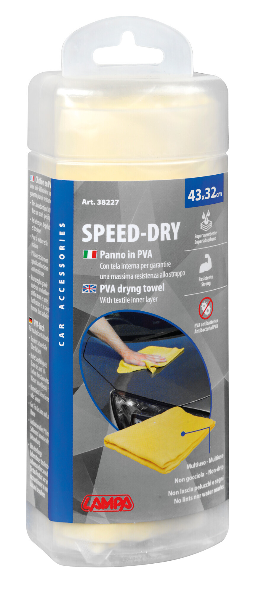 Panno scamosciato sintetico, con tela interna per una maggiore resistenza. Altissimo potere assorbente (fino a 9 volte il suo peso specifico)