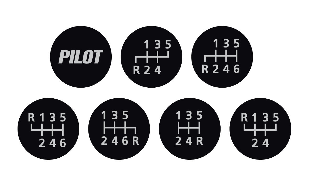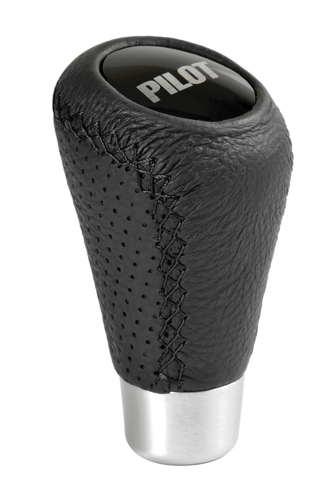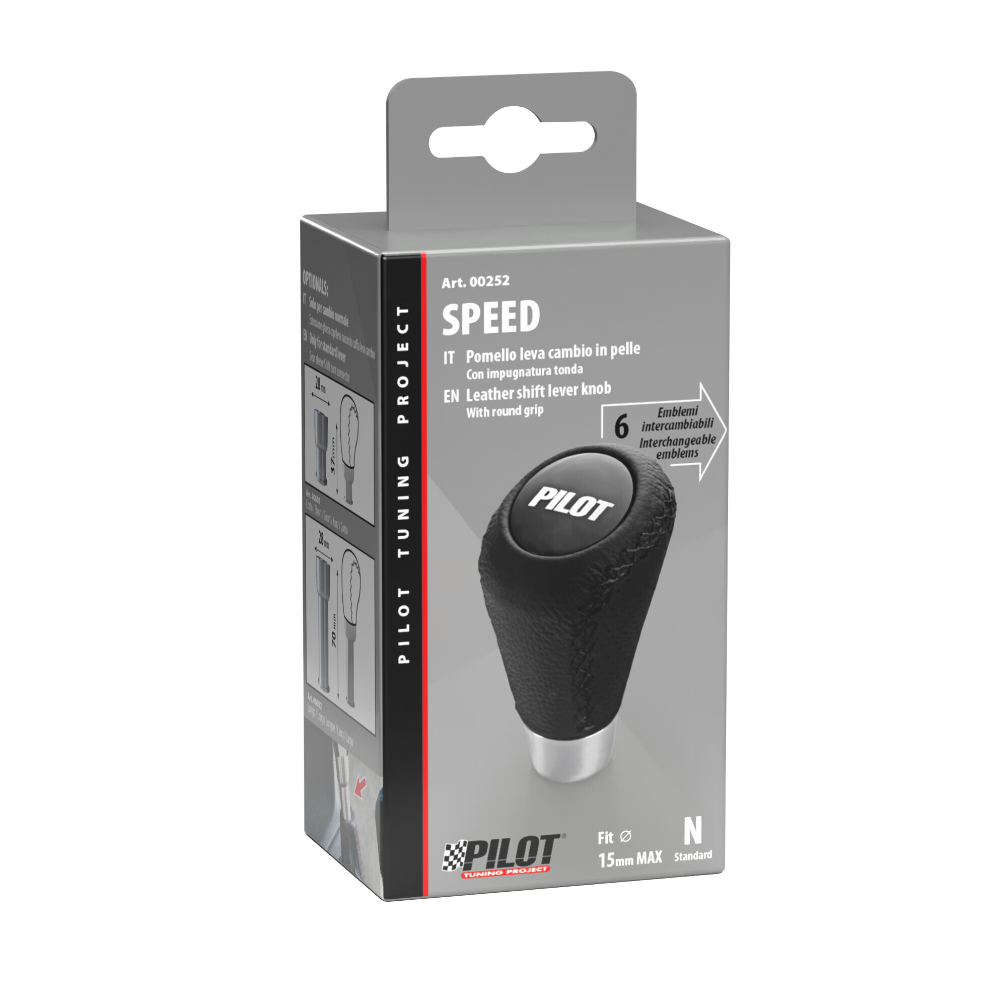 Pomello leva cambio in alluminio e pelle. 7 emblemi intercambiabili. Montaggio fai da te tramite kit con adattatori e chiave esagonale in dotazione. Attacco brevettato idoneo per leve cambio standard (Ø 15 mm max).