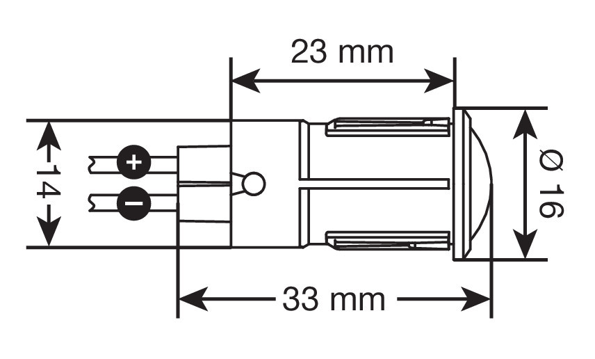20 mA max. Funzione:Acceso/Spento. 2 contatti. Foro Ø 14 mm. Spessore max 3,5 mm.