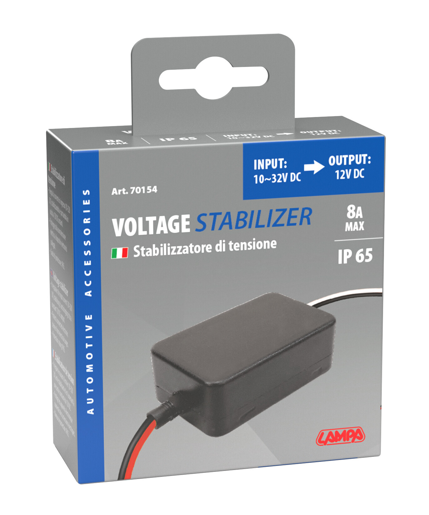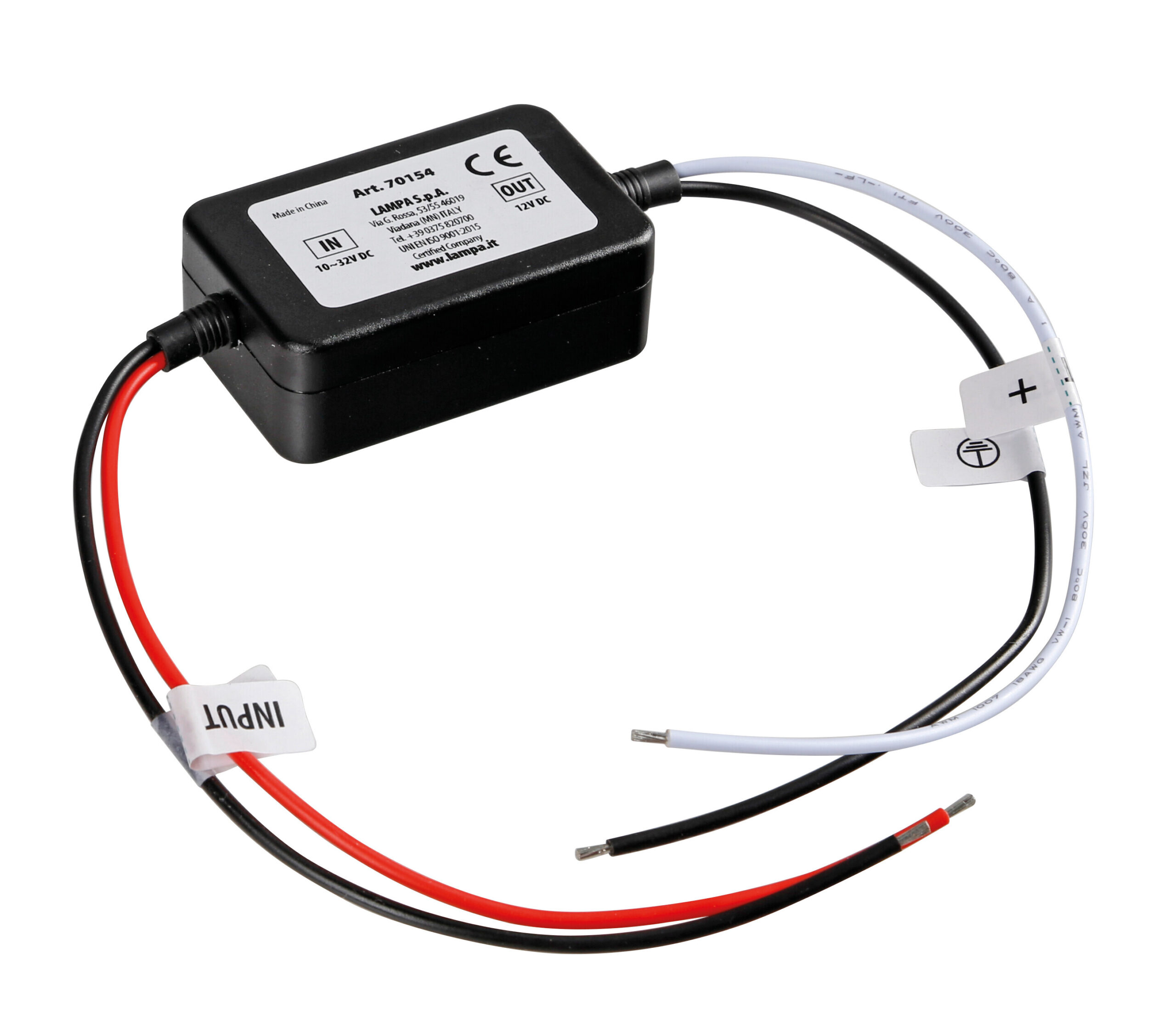 Regola la corrente in ingresso (10-32V DC) stabilizzandola e portandola in uscita a 12V DC costanti. Protegge dalla sovratensione elettrica i dispositivi elettronici collegati.