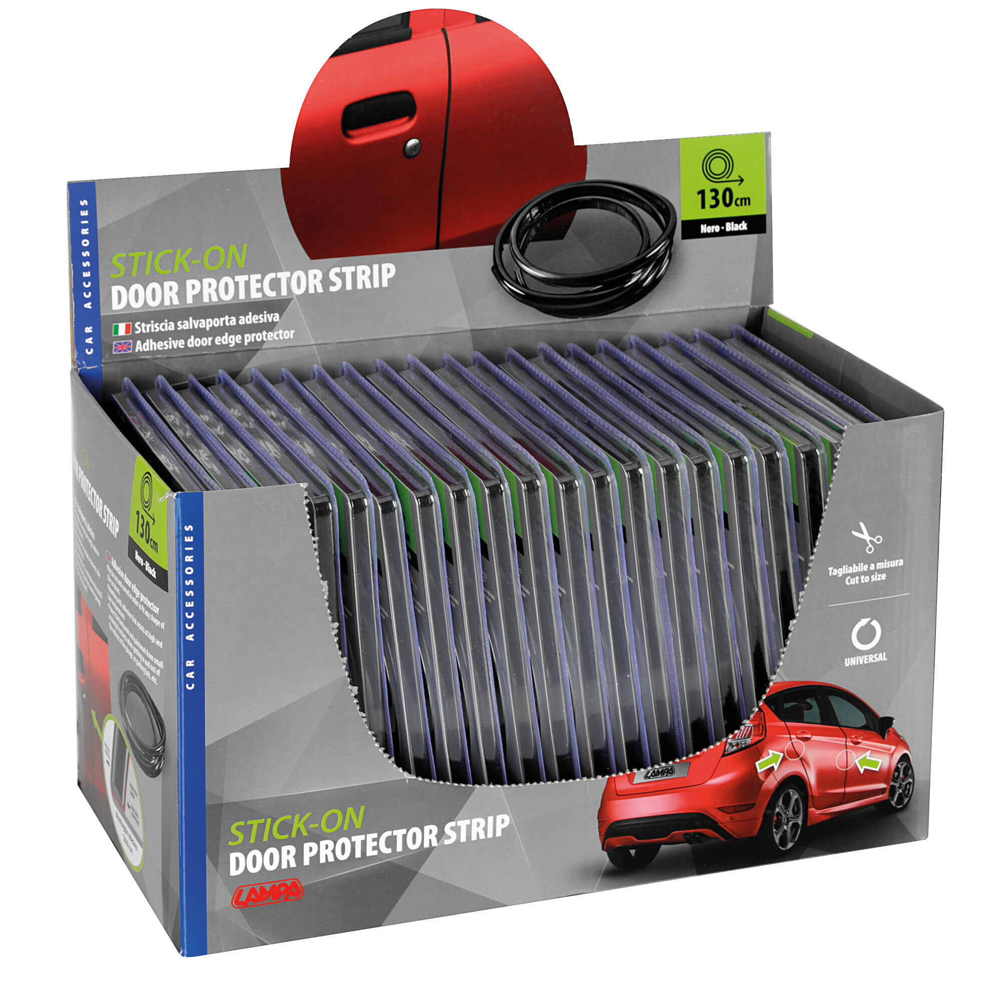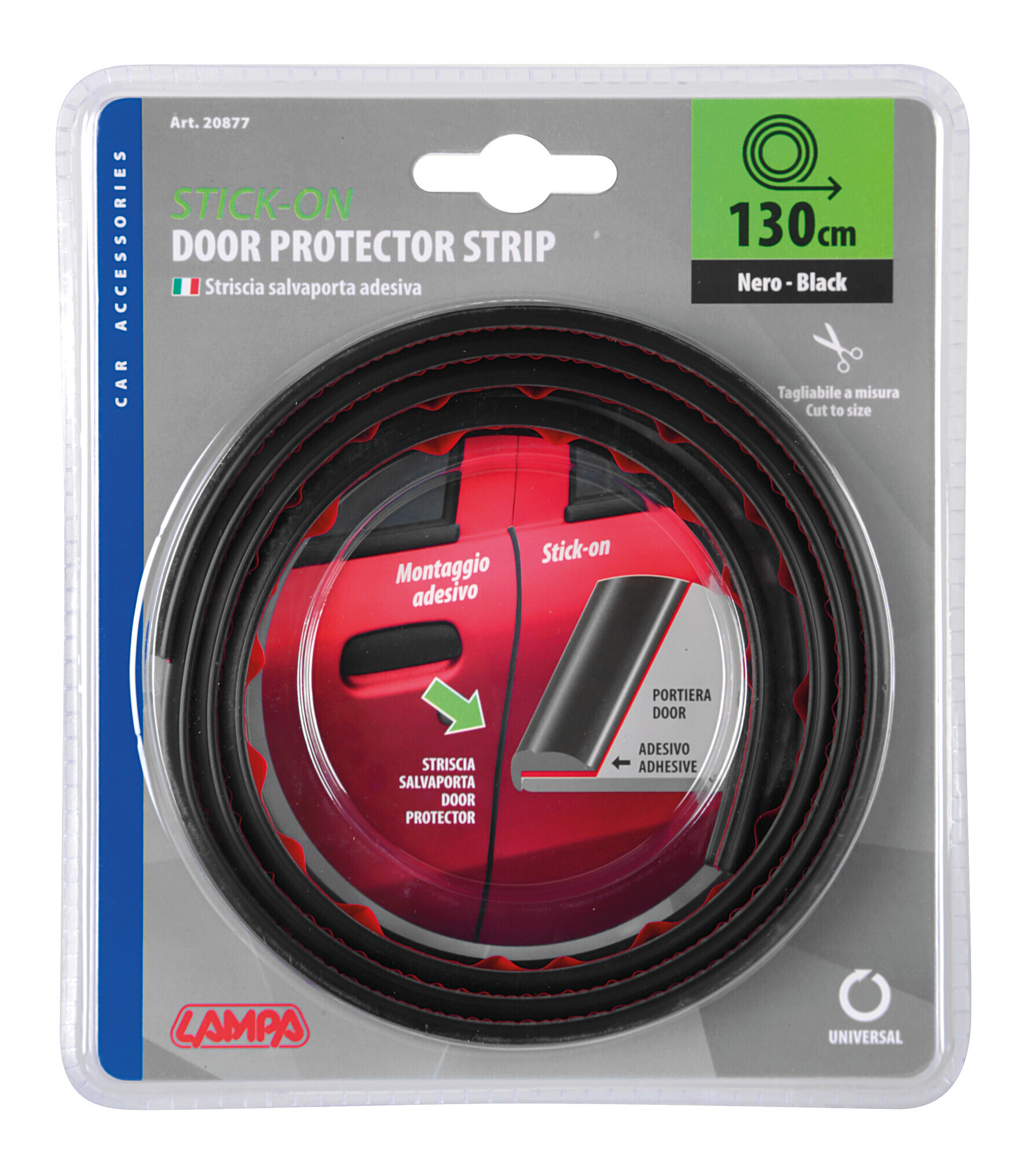 Può essere tagliata e curvata per aderire meglio alla forma delle portiere. Montaggio con adesivo a contatto resistente alle alte e basse temperature