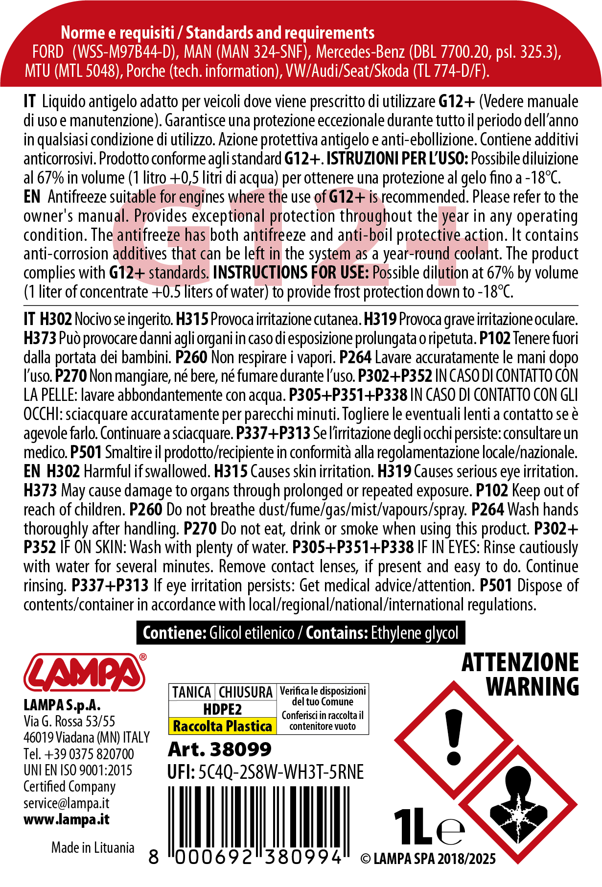 Pronto all’uso. Miscelato con antigelo di alta qualità, contiene additivi anticorrosivi che possono essere lasciati nel circuito come liquido refrigerante anche dopo l’inverno.
