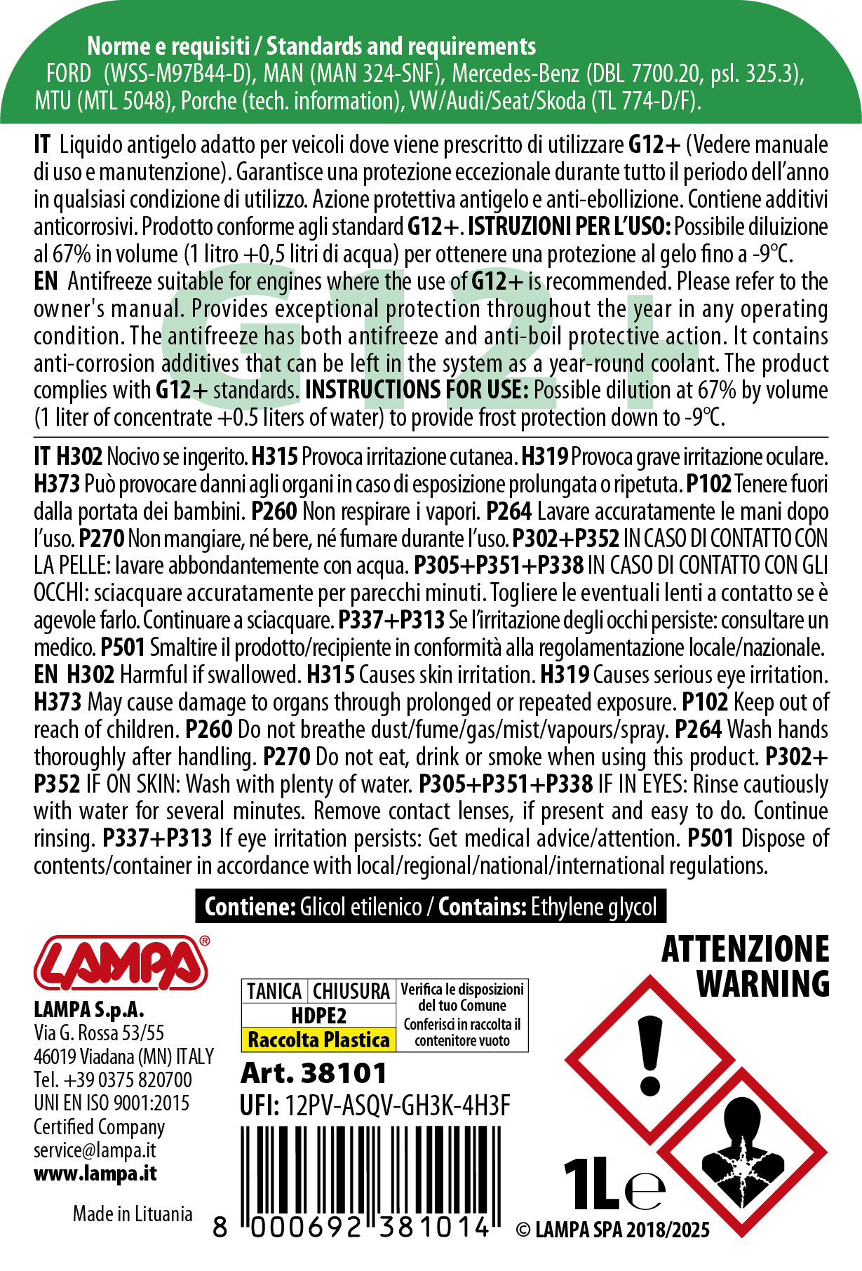 Pronto all’uso. Miscelato con antigelo di alta qualità, contiene additivi anticorrosivi che possono essere lasciati nel circuito come liquido refrigerante anche dopo l’inverno.