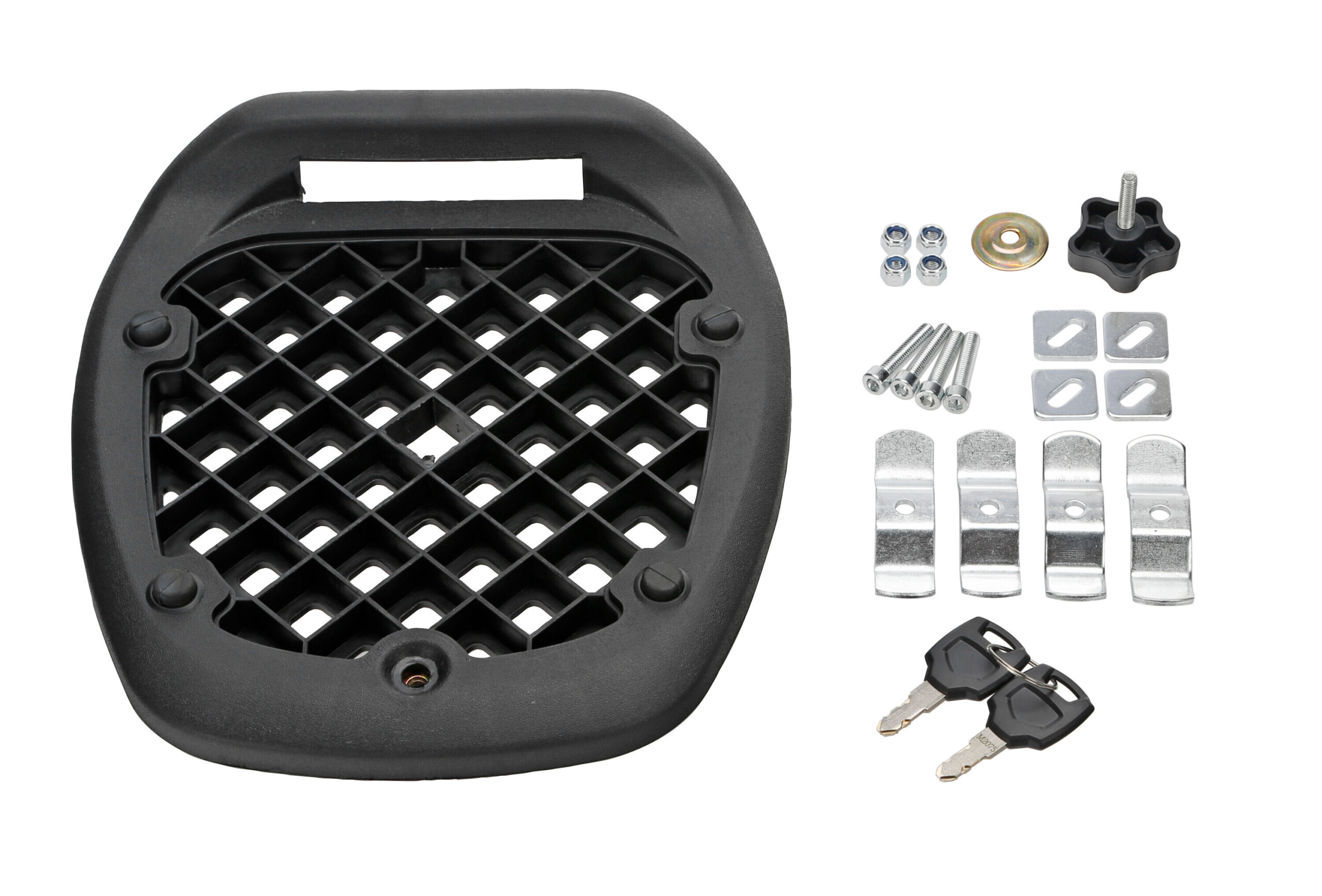 In materiale termoplastico. Completo di piastra e viti per il fissaggio. 2 chiavi in dotazione. Carico massimo 3 kg. Può contenere un casco integrale
