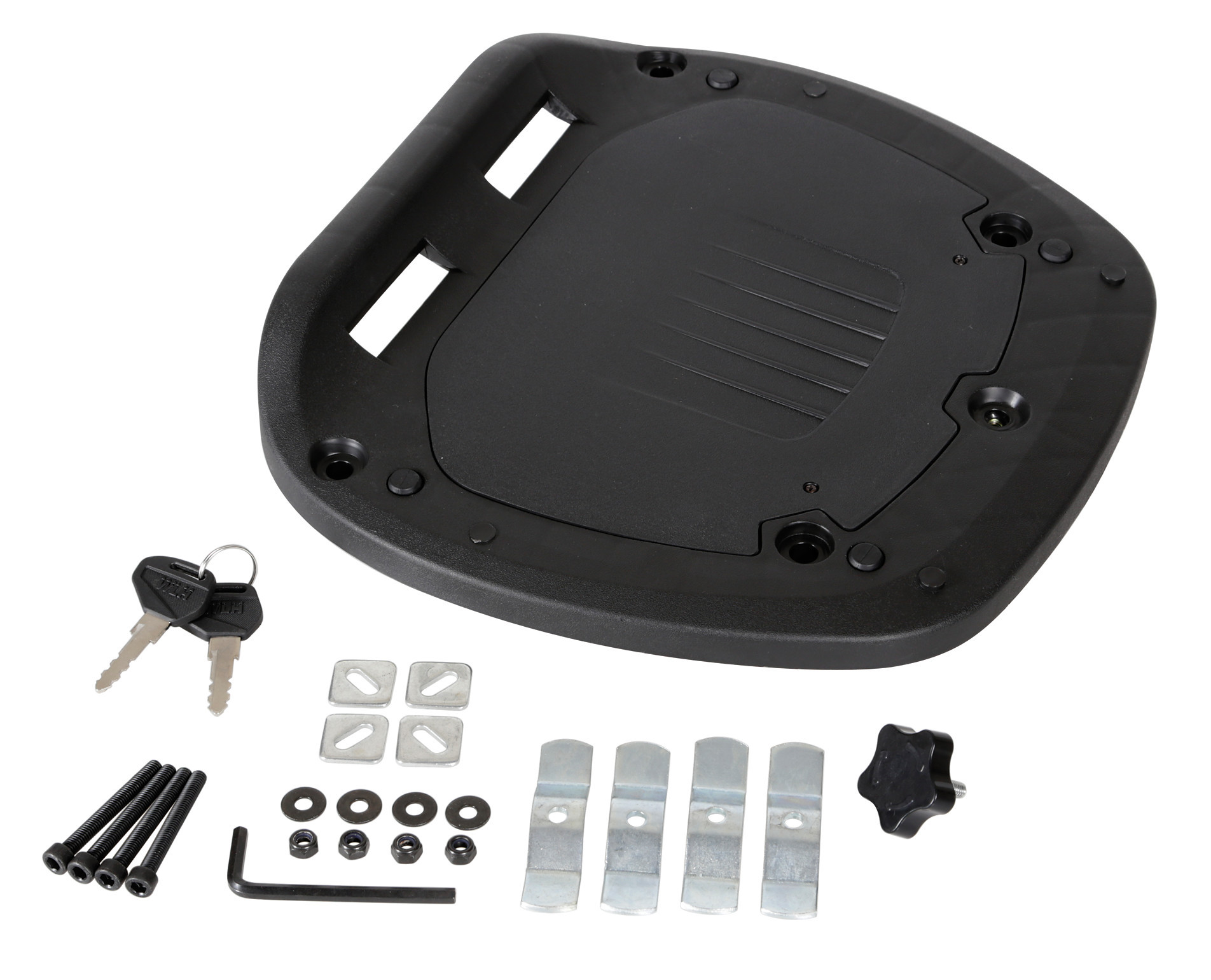Colore nero goffrato. Completo di piastra e viti per il fissaggio. 2 chiavi in dotazione. Carico massimo 4,5 kg. Può contenere due caschi integrali.