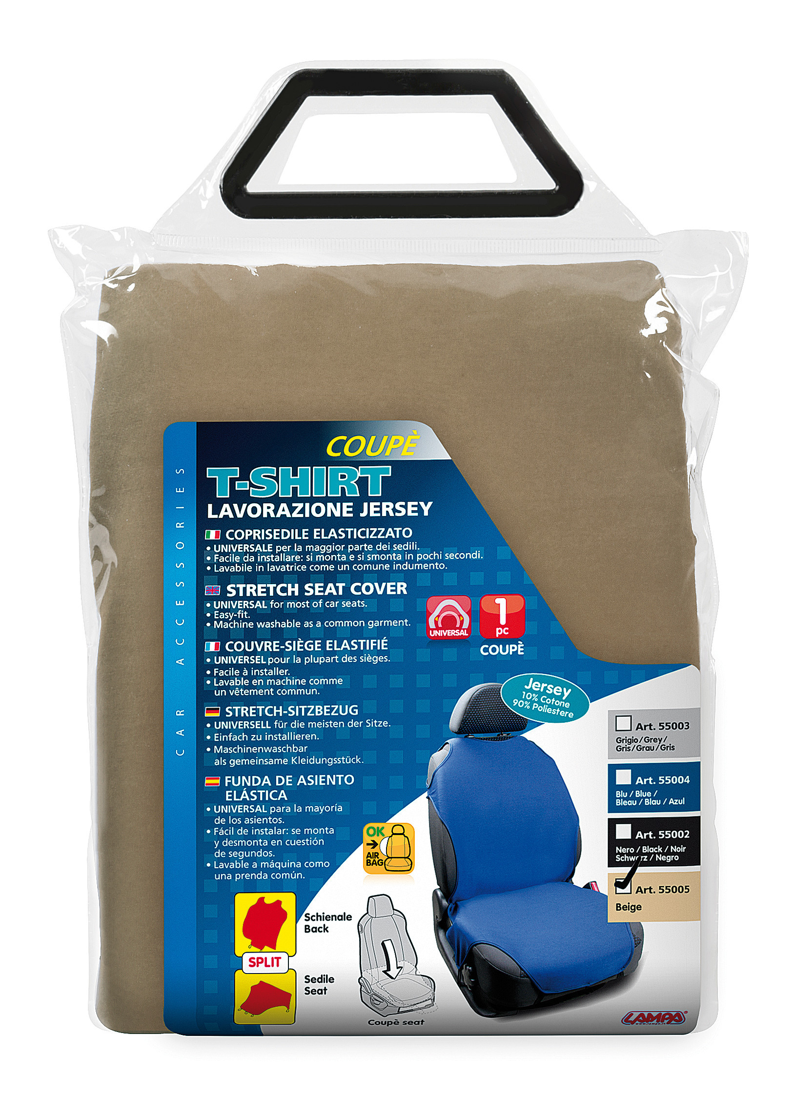 In tessuto Jersey (10% cotone, 90% poliestere). Schienale e seduta separati (per sedili ribaltabili). Facile da montare, si fissa al sedile tramite le cinghie in dotazione.