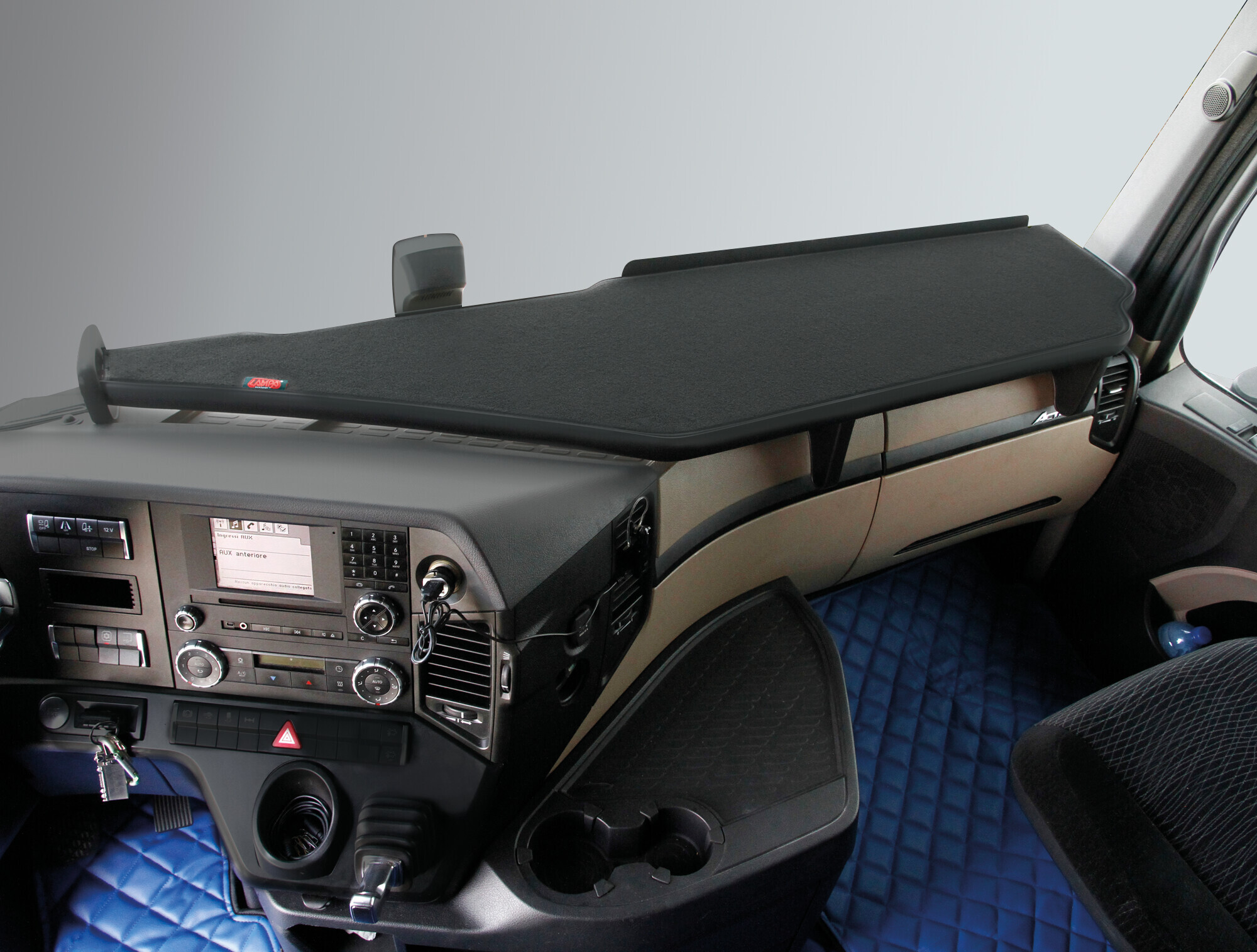Tavolino per cruscotto – Centrale + Passeggero – compatibile per Mercedes Actros MP4 (09/11>09/19) cabina stretta, con o senza telecamera – Mercedes Actros MP5 (10/19>) cabina larga, con o senza telecamera – Mercedes Actros MP5 L (11/21>) cabina larga, con o senza telecamera – Mercedes Actros MP5 F (11/21>)