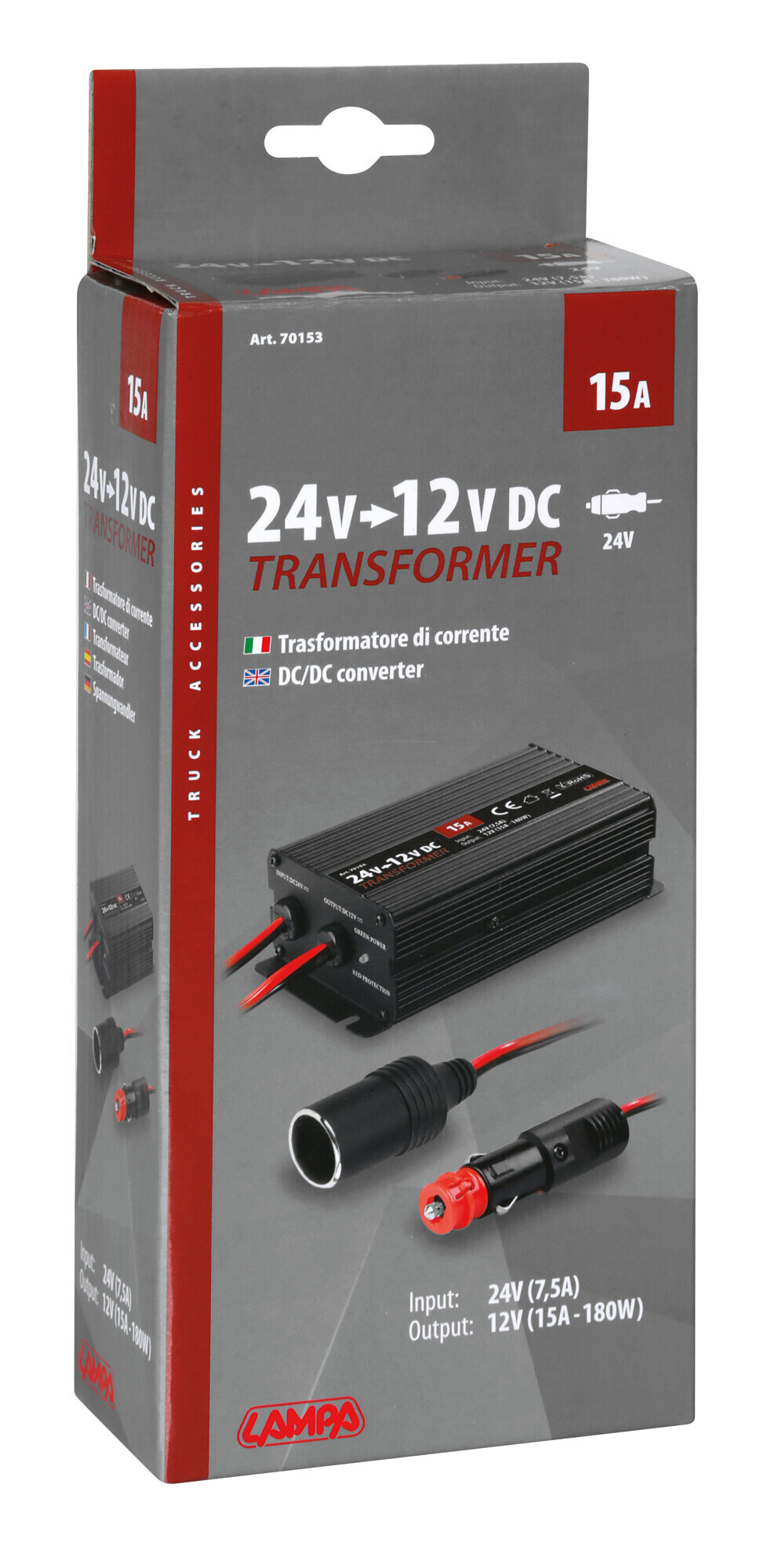 Permette di utilizzare le apparecchiature a 12V su tutti i veicoli industriali con impianto elettrico a 24V (camion, bus, trattori, macchine da cantiere…) Cavo da 75 cm
