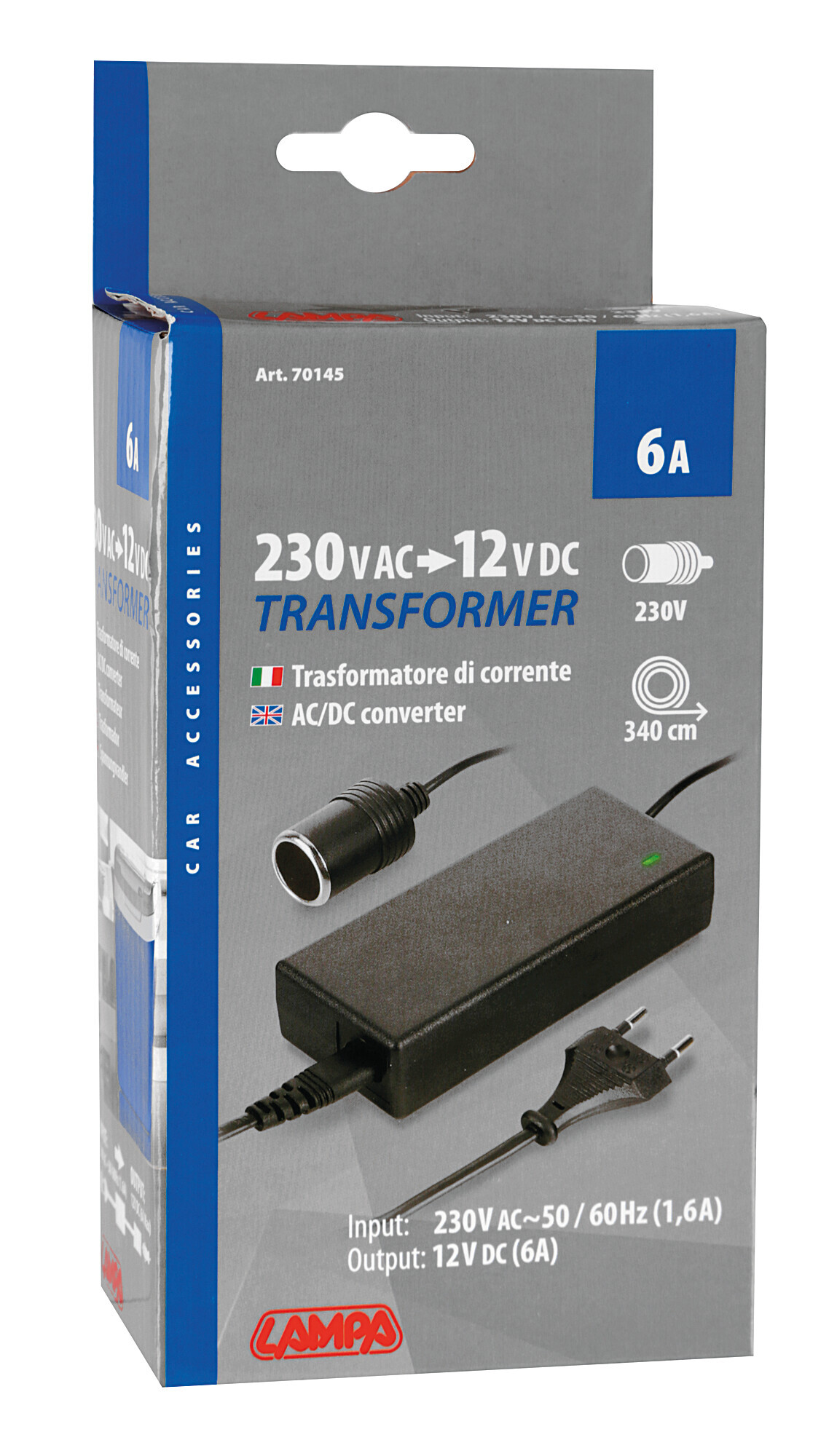 Permette di utilizzare, a casa o al campeggio, tutti gli apparecchi 12V comunemente collegati alla presa accendisigari in auto: frigoriferi, ventilatori, caricabatteria telefoni cellulari, lettori cd, lampade, torce… Cavo da 340 cm