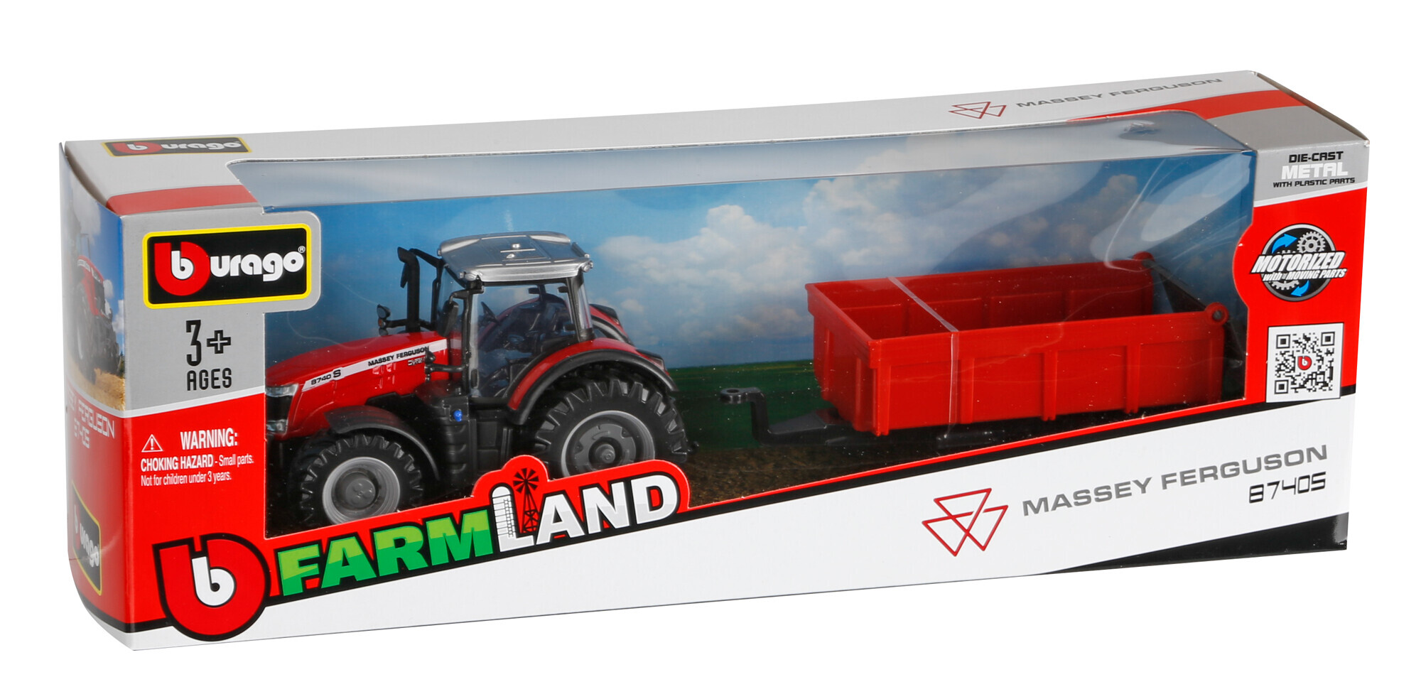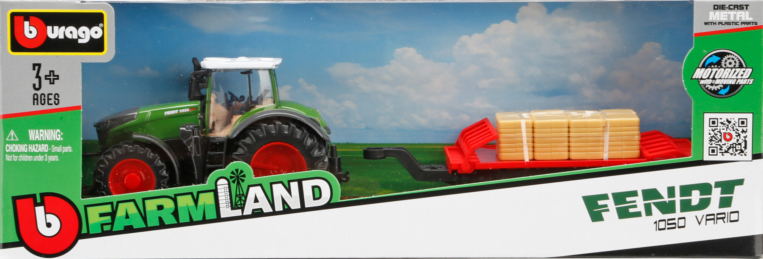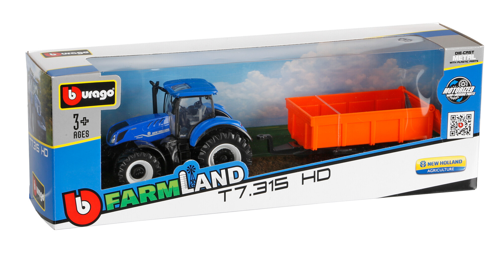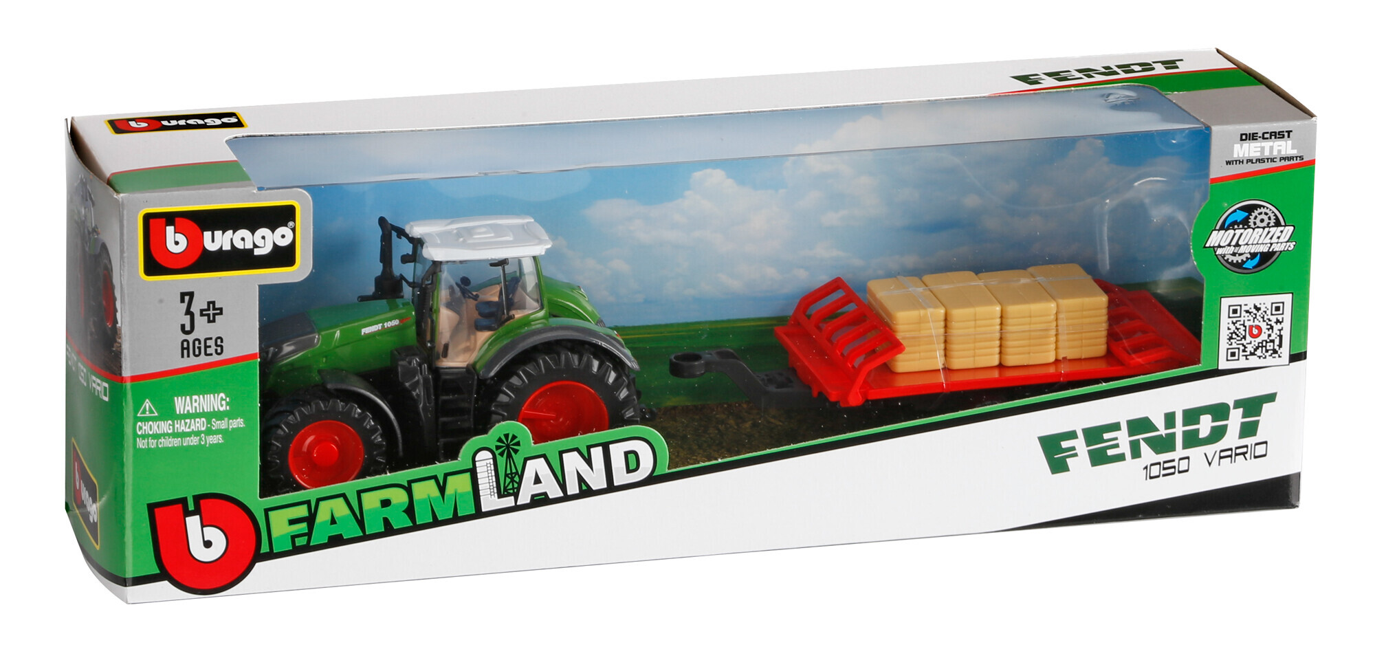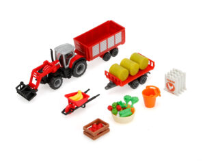 Trattore agricolo con rimorchio assortito, Burago, scala 1:43