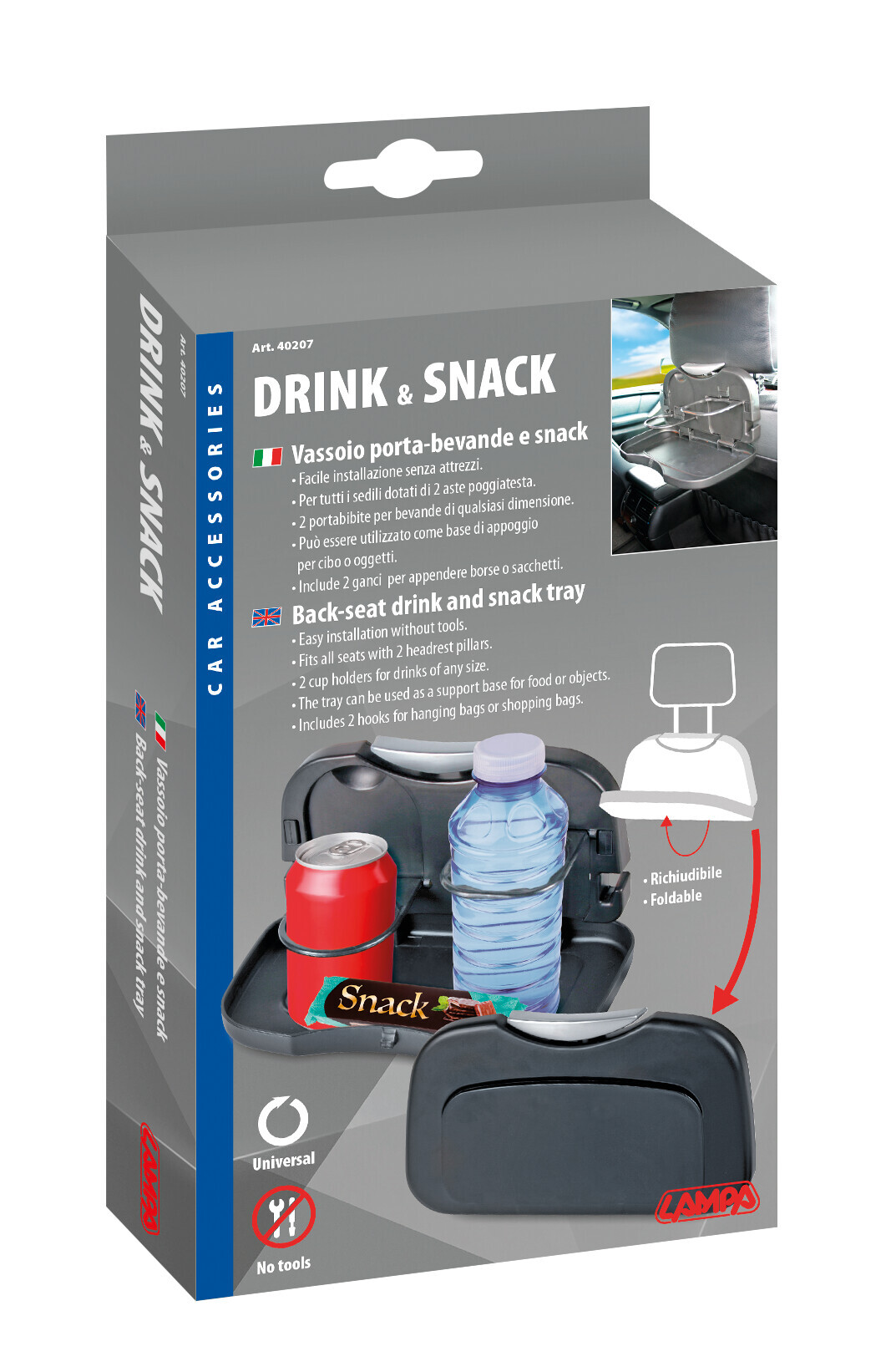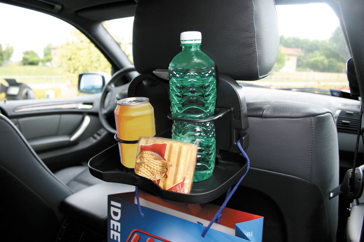 Per passeggeri posteriori. Per tutti i sedili dotati di 2 aste poggiatesta. Il vassoio è dotato di 2 ganci per appendere borse o sacchetti.
