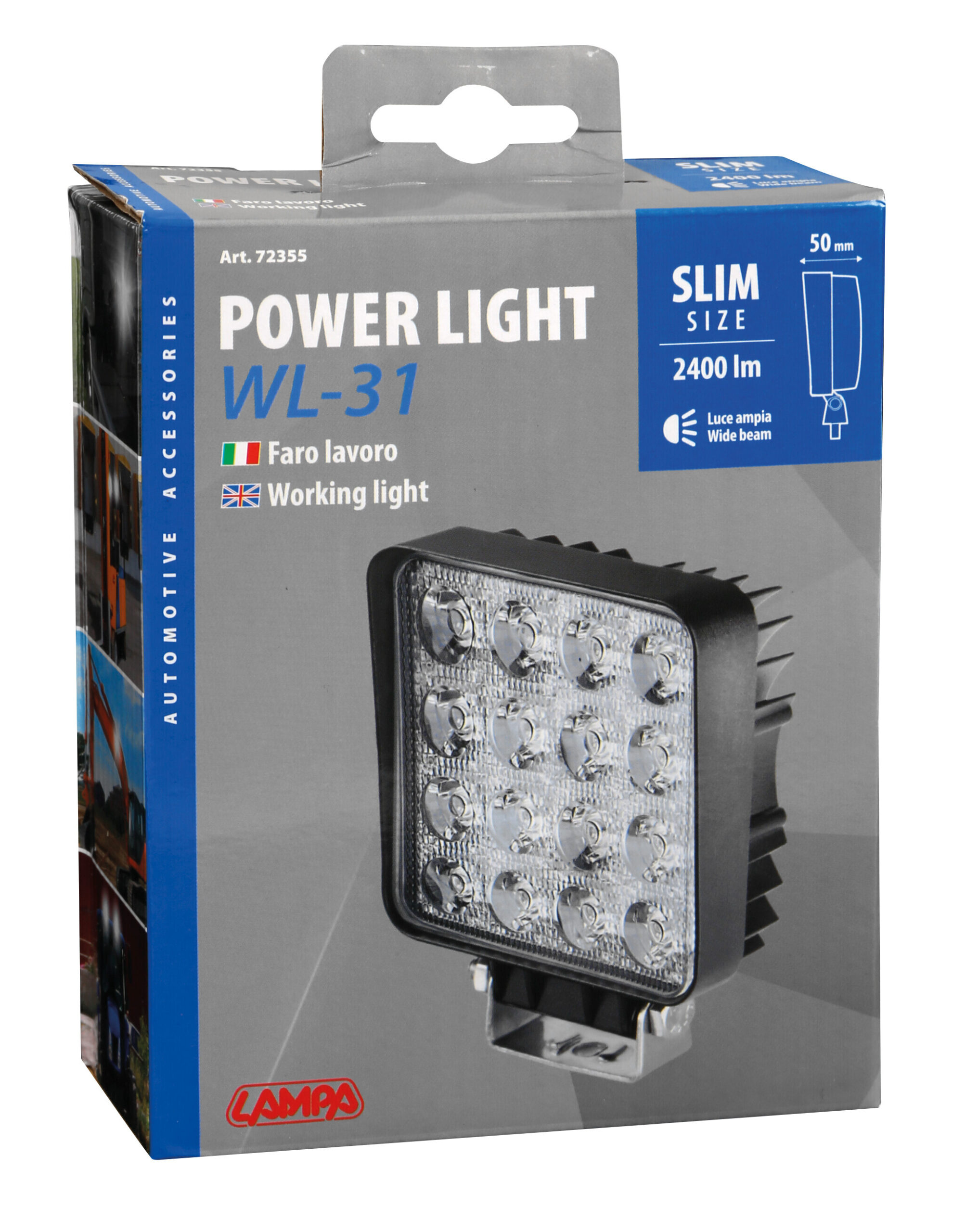 Struttura in alluminio, lente in PMMA, impermeabile IP67. Staffa in acciaio completa di viti per il fissaggio. Luce ampia multivoltaggio da 48W – 6000°K – 2400 lumen. Particolarmente indicato per moto, fuoristrada, camion, trattori, muletti, escavatori, ecc.