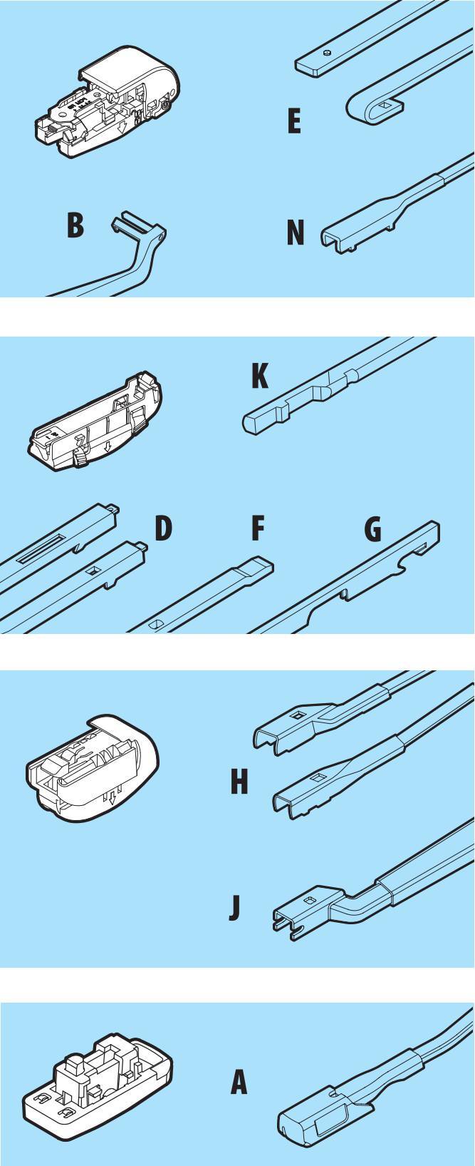 • Sistema di montaggio multiplo con raccordi in dotazione per il montaggio sulla maggior parte dei veicoli equipaggiati con tergicristalli tradizionali o con spazzole senza articolazioni.