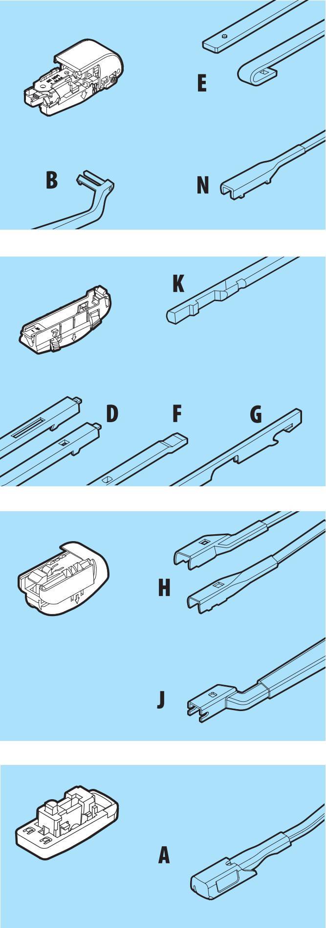 • Sistema di montaggio multiplo con raccordi in dotazione per il montaggio sulla maggior parte dei veicoli equipaggiati con tergicristalli tradizionali o con spazzole senza articolazioni.