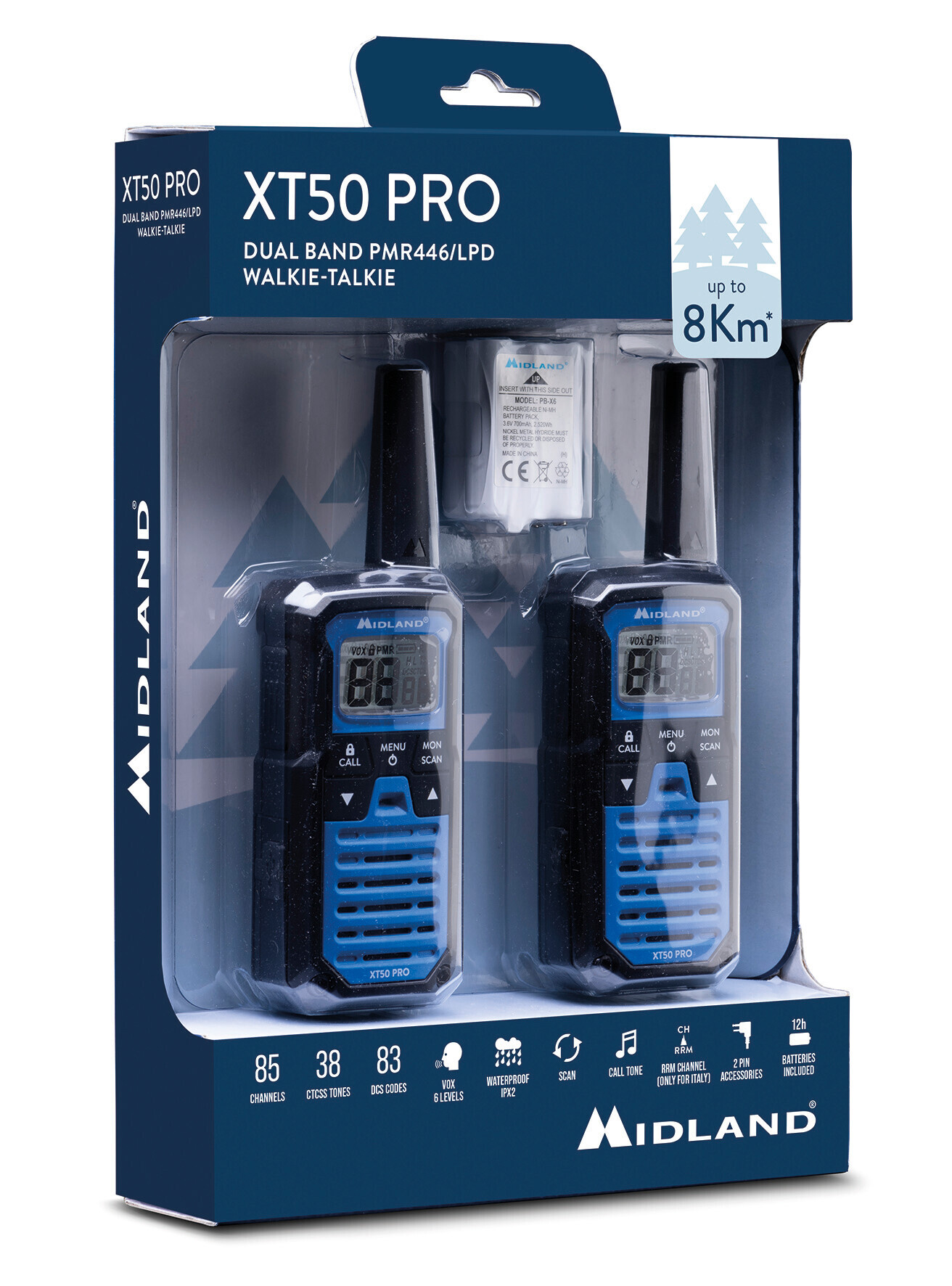 Comunicazione senza limiti fino a 8 km e una autonomia di 12 ore. È una radio che opera sia nella banda PMR446 che LPD garantendo cosi ben 85 canali di trasmissione! Il canale speciale RRM (Rete Radio Montana), garantisce sicurezza anche in emergenze durante le escursioni. Impermeabile con certificazione IPX2, resiste all’umidità. Dotato di 121 subtoni, 6 livelli di VOX e display LCD retroilluminato per una visibilità ottimale. Leggero, compatto e con presa accendisigari a 2 pin Midland, l’ XT 50 PRO è perfetto per tutte le tue avventure. Utilizzo senza licenza.