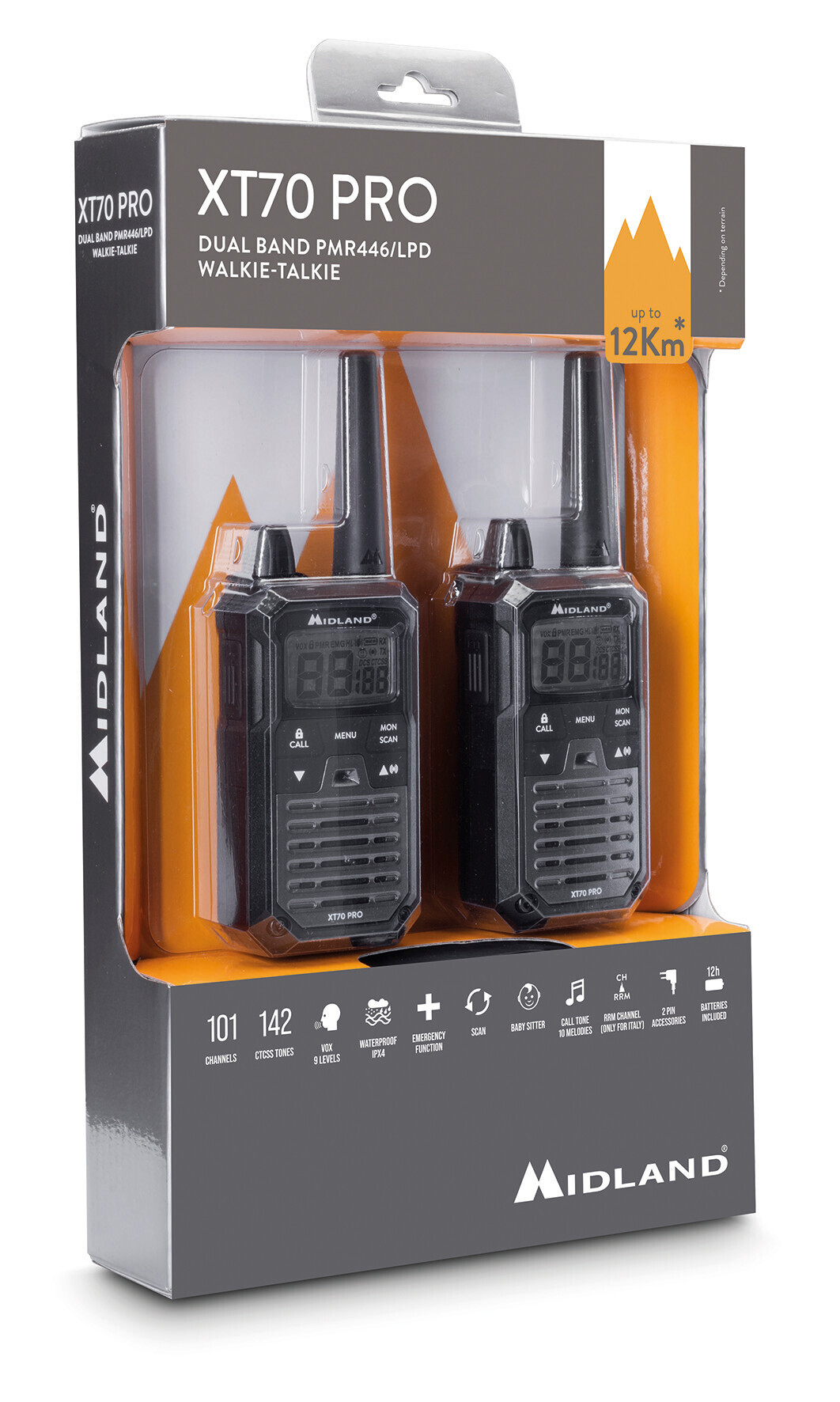Midland XT70 PRO offre comunicazioni affidabili su una banda di frequenza estesa con 101 canali totali e 142 subtoni CTCSS/DCS. Ideale per ambienti lavorativi e outdoor, garantisce una copertura fino a 12 km e una autonomia di ben 12h. La funzione VOX con 9 livelli di sensibilità attiva automaticamente la trasmissione rilevando la voce, consentendo un utilizzo a mani libere. La modalità SCAN esegue una ricerca automatica delle frequenze disponibili, facilitando il contatto rapido con altri dispositivi. Progettato per resistere a condizioni difficili, dispone di certificazione IPX4 che lo protegge da spruzzi d’acqua. Il canale RRM (Rete Radio Montana) permette di segnalare emergenze e ricevere aggiornamenti di sicurezza, rendendolo perfetto per escursionisti e lavoratori sul campo. Utilizzo senza licenza.
